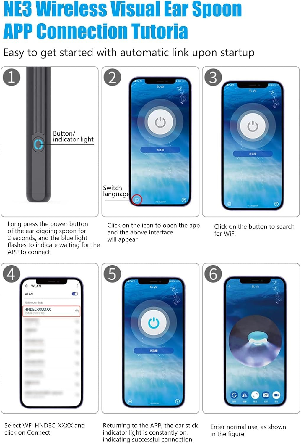 - Support Android and IOS Devices: Scan the QR code to download the APP. Press and hold the switch button to turn it on, and connect the earwax Removal with camera through the device's WIFI to start using. The photos and videos taken by the device will be stored in the App album. If you want to save them in your phone album, please allow the App to access your album.